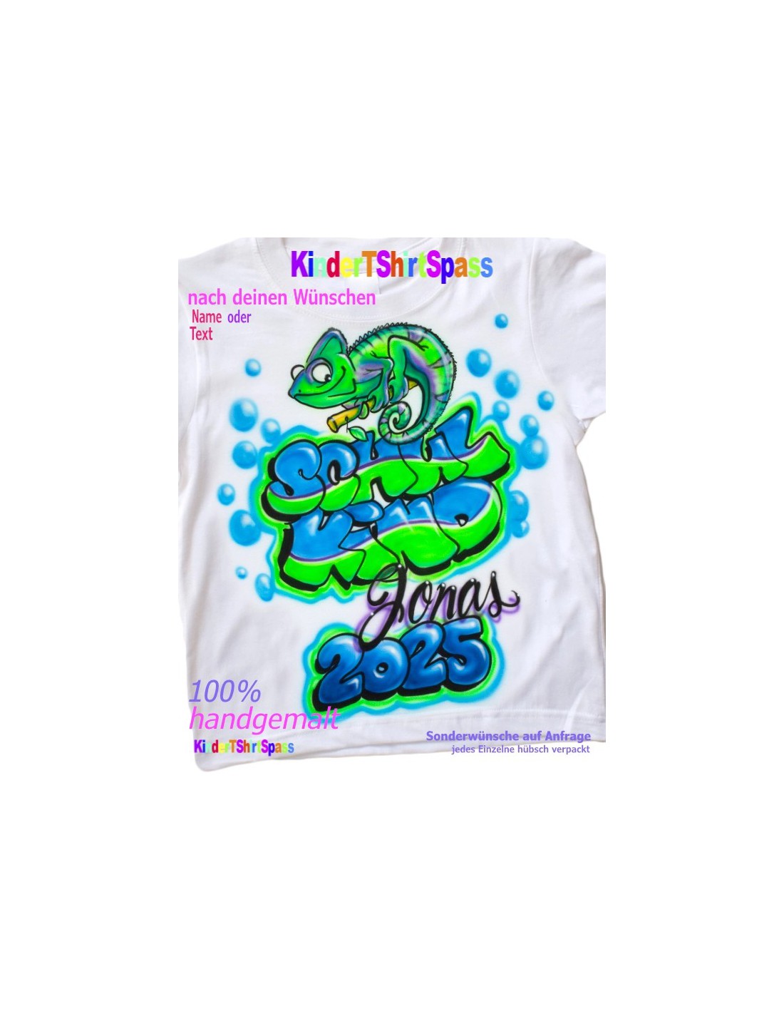 Bitte zuerst Ihren Wunschnamen speichern, damit Sie den Artikel in den Warenkorb legen könnenFarbenfroh und einzigartig: Diese Shirt mit Chamäleon im Graffiti Stil wird individuell gestaltet und ist ein echter Hingucker.