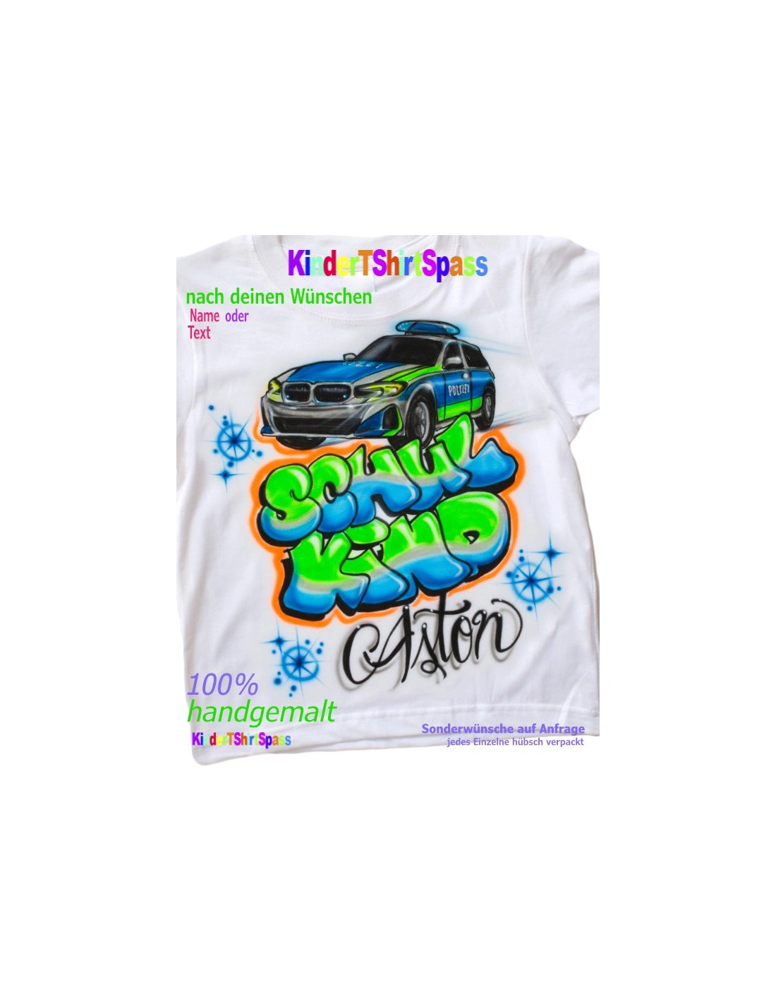 Kinder-Shirt mit Polizeiauto und Namen zur Einschulung. Handbemalt und individuell ❤️