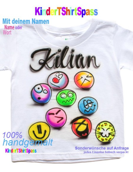 Hier findest du kein original Smiley Gesicht, sondern lustige Lachgesichter für deine Smiley Party. Emoticons waren gestern! Wir lassen unsere lustigen „Happy Face“ Gesichter als Katze, Clown, X, oder Glubschi belustigt schauen. Gesichtsausdrücke von niedlich blinzelnd, frech grinsend bis genervtes Augenrollen ist alles dabei. Typisch für KinderTShirtSpass, alles handgemalt mit Airbrush für Kinder und Erwachsene ebenso möglich, schreib uns!